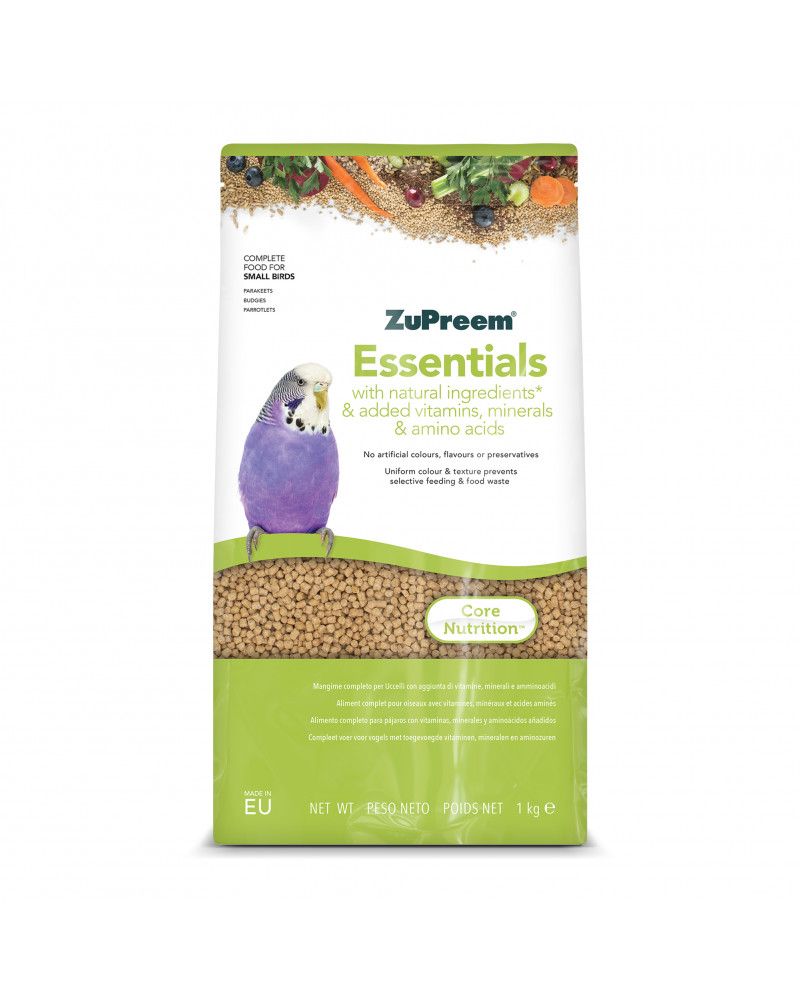 Alimento completo per uccelli. ZuPreem Essentials, con aggiunta di vitamine, minerali e aminoacidi, è un alimento completo per uccelli da compagnia, che fornisce una nutrizione sana e gustosa ogni giorno a pappagallini ondulati, parrocchetti, piccoli pappagalli e altri uccelli di piccola taglia che preferiscono pellet di queste dimensioni.