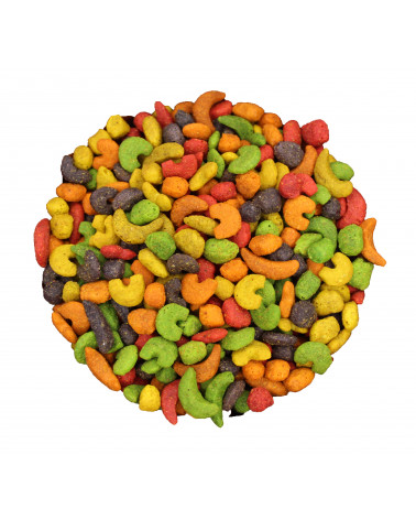 Composizione: Mais, mangime a base di farina di soia (cereali), frumento, saccarosio, germe di frumento, olio di soia, carbonato di calcio, olio di colza, fosfato bicalcico, cloruro di sodio, mele, banane, arance, uva, lolla di riso.