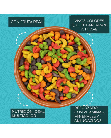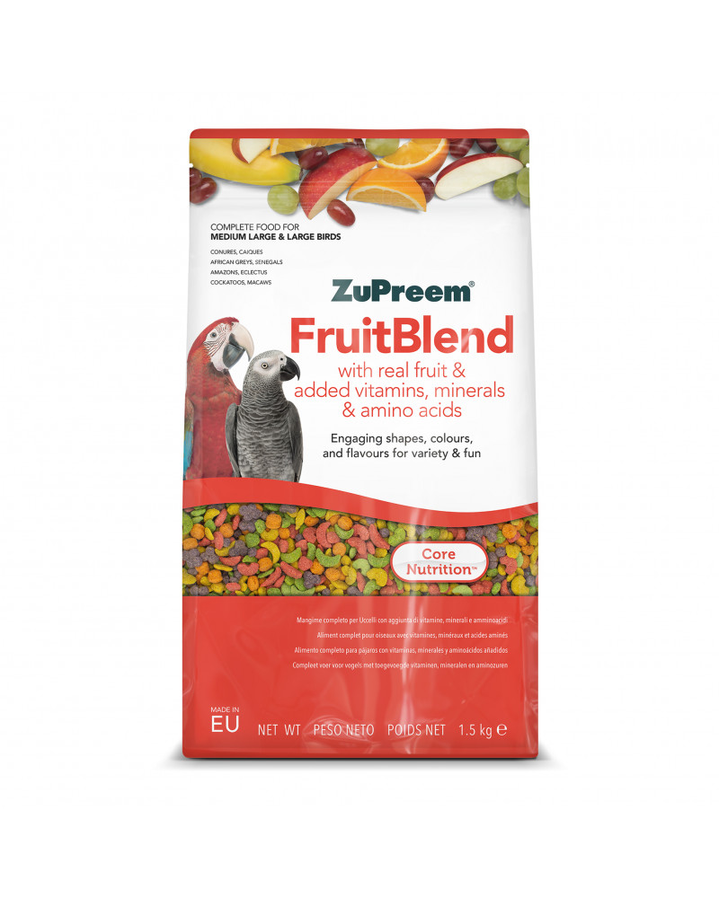 Alimento completo per uccelli. FruitBlend con vera frutta è un alimento completo per uccelli da compagnia che fornisce una nutrizione sana e gustosa ogni giorno a parrocchetti, caicchi, pappagalli cenerini africani, pappagalli del Senegal, pappagalli amazzoni, pappagalli ecletto, ara, cacatua e altri uccelli che preferiscono pellet di queste dimensioni.