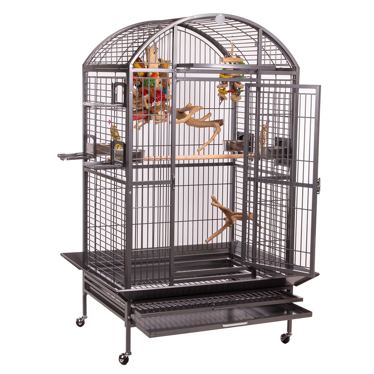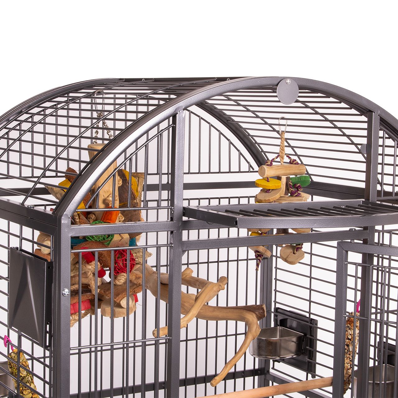 Questo modello è fornito con un posatoio, quattro porte esterne con vassoi in acciaio inox, una porta per il nido e una gonna di raccolta che impedisce la fuoriuscita di cibo e sporco. La Hacienda Dome è inoltre dotata di una griglia rimovibile e di stabili piedini di supporto.