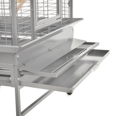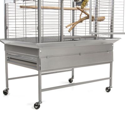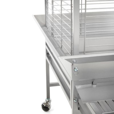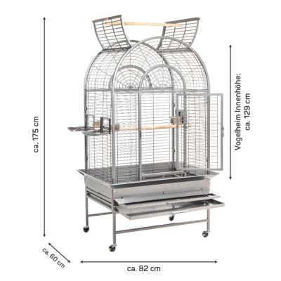 La New Jersey colpisce per l’elegante sportello e il tetto apribile. La fornitura comprende ciotole in acciaio inox, un posatoio, un grembiule di raccolta e robuste rotelle.