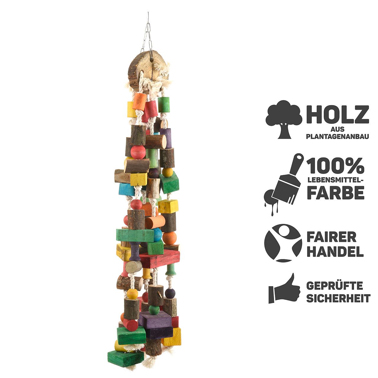 Il Giant Giggle è un giocattolo davvero grande per pappagalli, alto quasi 90 cm. Realizzato in vero legno, con blocchi di legno colorati, palline di legno e corde di cotone, è un giocattolo molto interessante per tutti i pappagalli di grandi dimensioni.