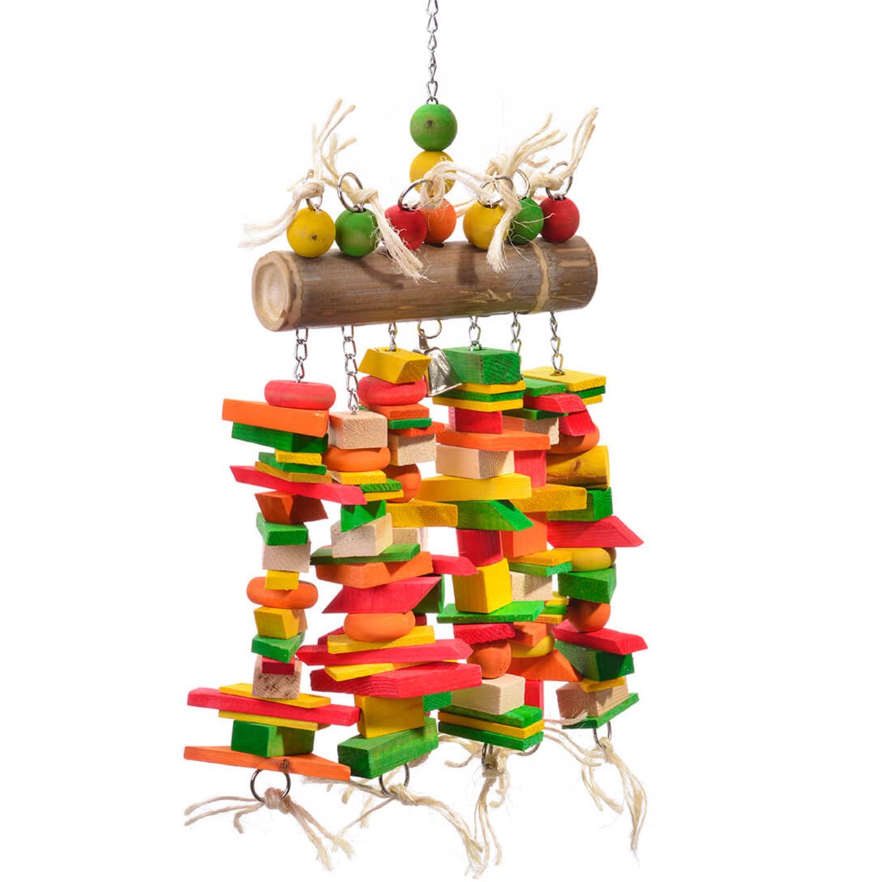 Questo gioco da appendere di alta qualità combina materiali resistenti con diverse attività, garantendo un divertimento duraturo. Il fulcro è un robusto tubo di bambù, al quale sono fissate diverse catene di piastre e blocchi di legno. Questi stimolano l’istinto naturale di masticare, promuovono le capacità motorie e offrono una sfida stimolante per il vostro amico pennuto.