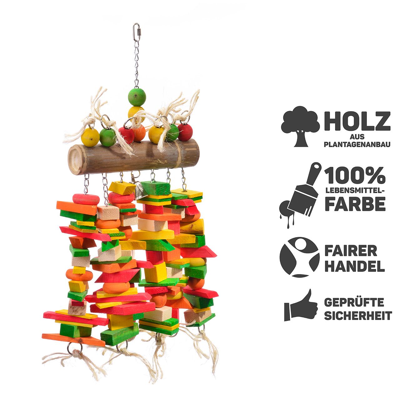 Realizzato in legno naturale non trattato e robusto bambù, questo gioco non è solo sicuro, ma anche estremamente resistente. La catena in acciaio inossidabile con moschettone di sicurezza garantisce un fissaggio facile e sicuro alla gabbia, assicurando che il gioco rimanga appeso saldamente e che il vostro pappagallo possa giocare senza preoccupazioni.