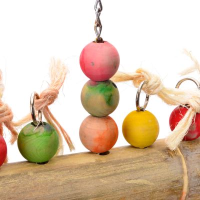 Realizzato in legno naturale non trattato e robusto bambù, questo gioco non è solo sicuro, ma anche estremamente resistente. La catena in acciaio inossidabile con moschettone di sicurezza garantisce un fissaggio facile e sicuro alla gabbia, assicurando che il gioco rimanga appeso saldamente e che il vostro pappagallo possa giocare senza preoccupazioni.