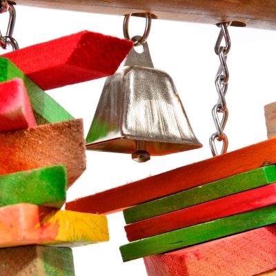 Questo gioco da appendere di alta qualità combina materiali resistenti con diverse attività, garantendo un divertimento duraturo. Il fulcro è un robusto tubo di bambù, al quale sono fissate diverse catene di piastre e blocchi di legno. Questi stimolano l’istinto naturale di masticare, promuovono le capacità motorie e offrono una sfida stimolante per il vostro amico pennuto.