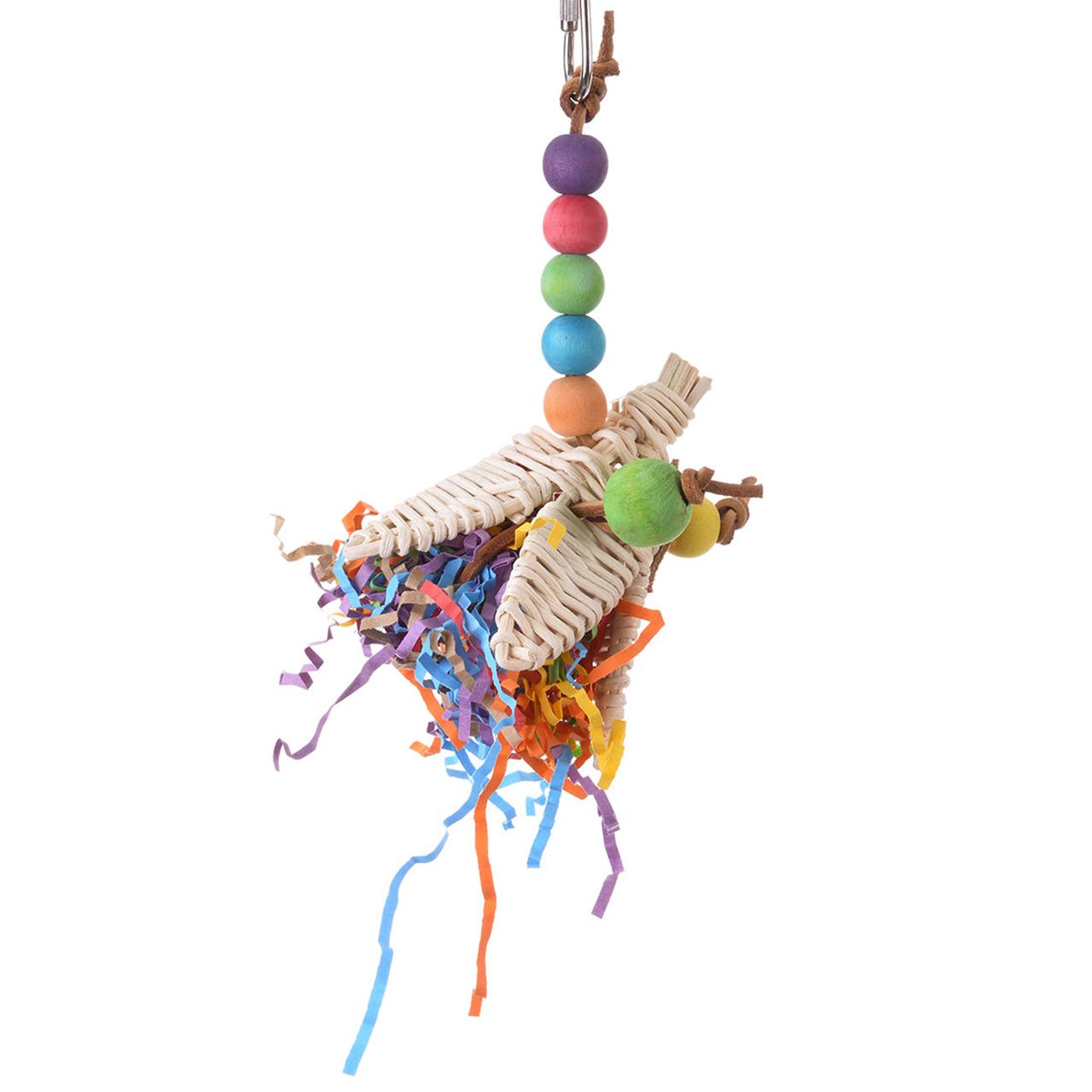 Questo giocattolo è riempito con strisce di carta e sigillato con una piccola pallina di rattan. Come sistema di sospensione è presente una cinghia in cuoio conciato al vegetale, decorata con perline di legno e un piccolo inserto in pelle.