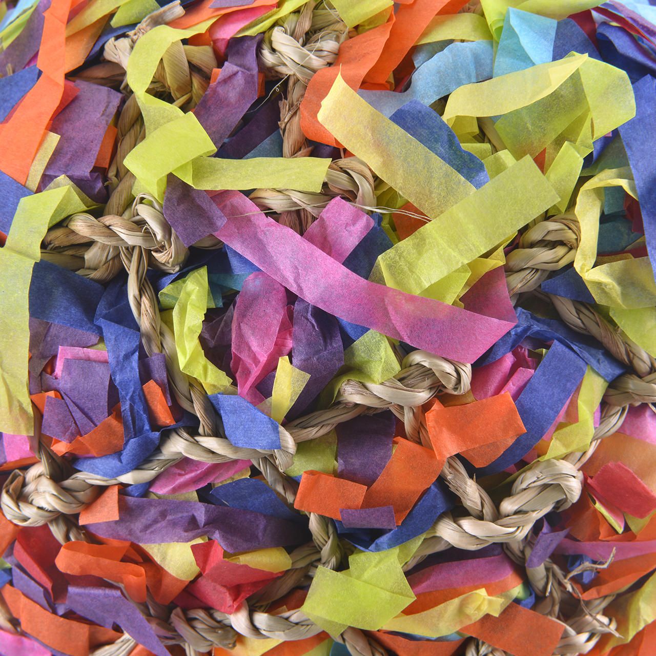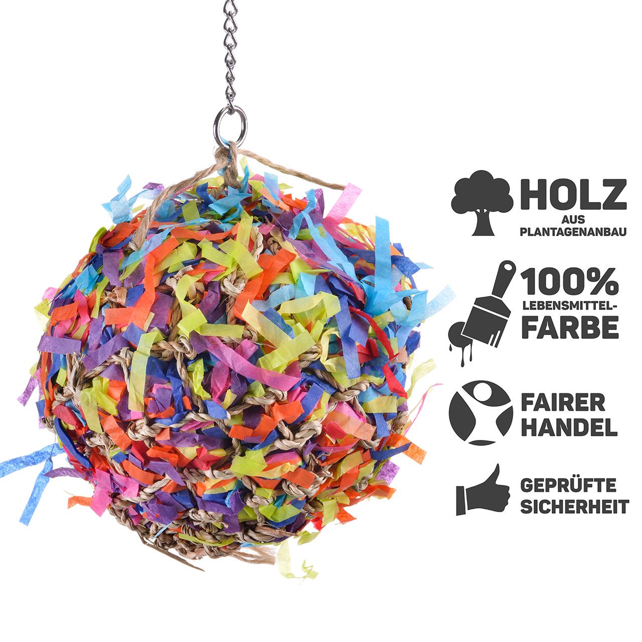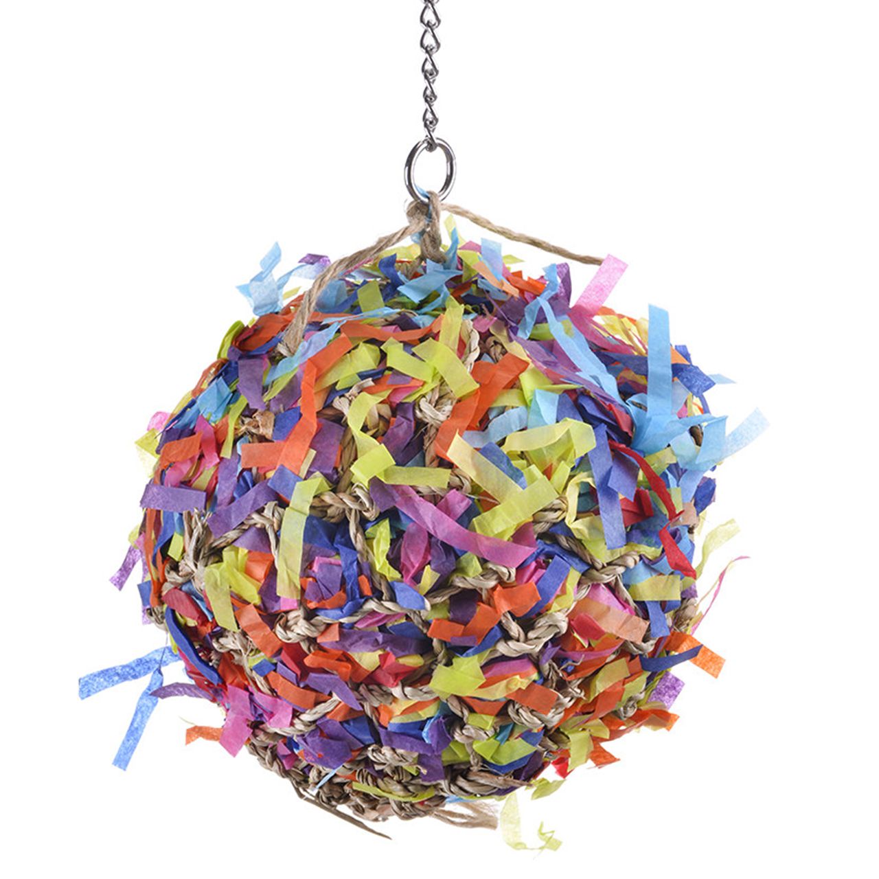 La grande palla da sminuzzare è il giocattolo perfetto per stimolare la ricerca del cibo nei vostri uccelli di medie e grandi dimensioni. Questa palla in rete di iuta è riempita con carta sminuzzata colorata, perline di legno tinte con coloranti alimentari, rocchetti, blocchi, bottoni e molto altro. Il vostro uccello sarà impegnato per settimane a cercare i tesori nascosti al suo interno. Misura circa 38 cm di altezza con un diametro di 20 cm. È dotata di un pratico gancio per fissarla facilmente alla gabbia.