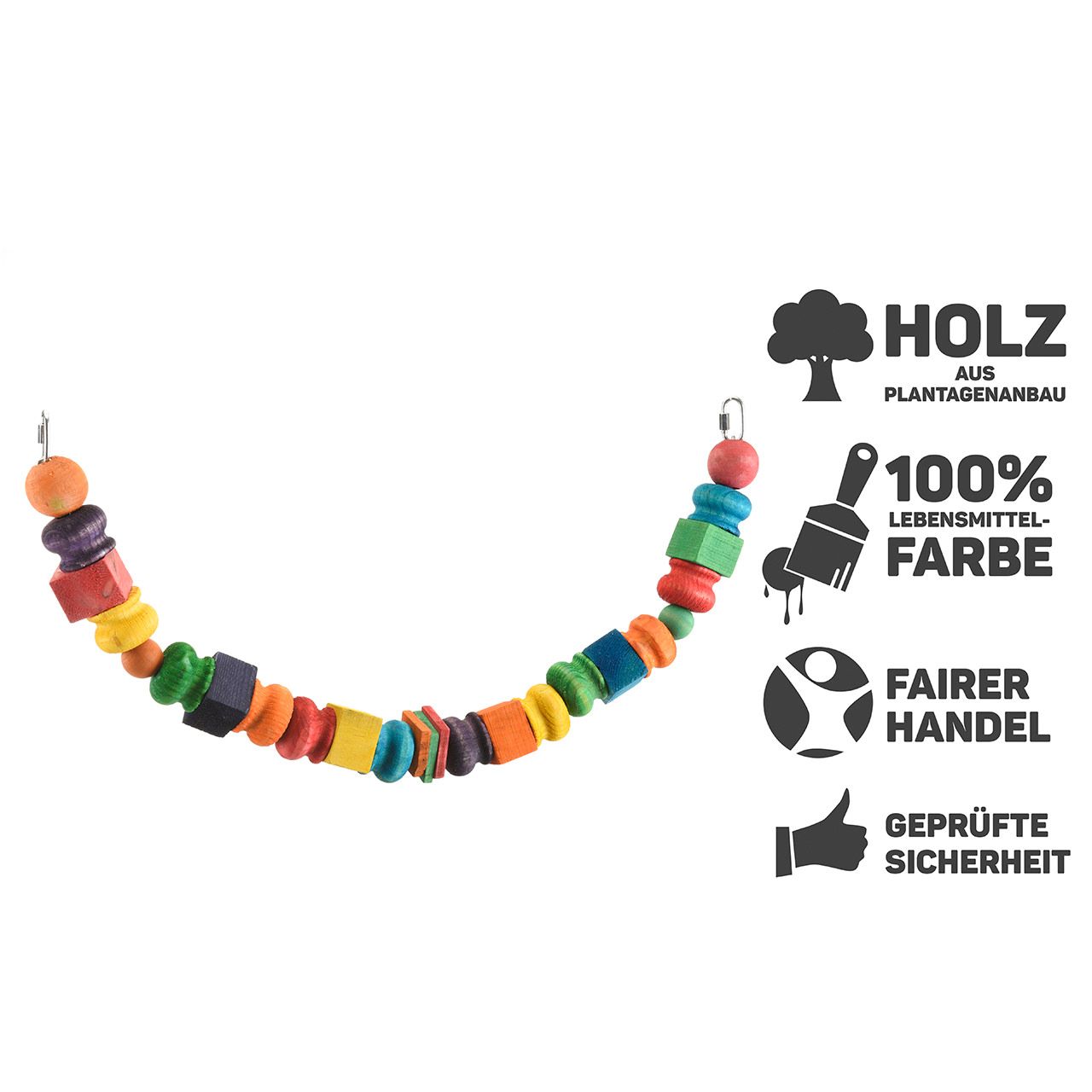 Un enorme ponte di legno da arrampicata. Tanti punti su cui arrampicarsi, stare in equilibrio, dondolarsi e rosicchiare. Un classico della nostra collezione di giocattoli dal 1997.